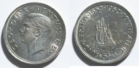 O Bare head of George VI left, HP (Humphrey Paget) initials on neck truncation GEORGIVS SEXTVS REX R A sailing ship seen from the stern, land in front of it, 300th anniversary of the founding of Capetown SUID-AFRIKA 1652-1952 SOUTH AFRICA 5S O Laureated head of Elizabeth II right ELIZABETH II REGINA R A Springbok running right SUID-AFRIKA date SOUTH AFRICA 5S O First arms of South Africa, a shield with the figure of Hope in the first quarter, two wildebeests in the second quarter, an orange tree in the third quarter, and a wagon in the fourth quarter SUID-AFRIKA 1960 SOUTH AFRICA 5S R Long building, 1910 above and 1960 below, commemorating the 50th anniversary of the South African Union EENDRAG MAAK MAG UNITY IS STRENGTH 1910 1960 O A Springbok running right SUID-AFRIKA date SOUTH AFRICA 50C R Bust of Jan van Riebeeck three-quarter facing to right EENDRAG MAAK MAG UNITY IS STRENGTH